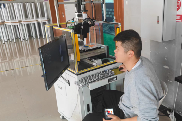(張朝、田鳳老師指導的學生潘慧君在機器視覺系統(tǒng)應用項目比賽現(xiàn)場)