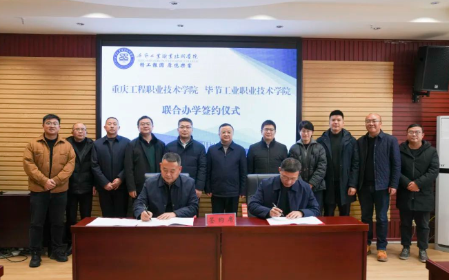 張進(jìn)在講話中表示,重慶工程職業(yè)技術(shù)學(xué)院大力支持與畢節(jié)工業(yè)職業(yè)技術(shù)學(xué)院開展合作,今后將在高水平專業(yè)建設(shè)、實(shí)習(xí)實(shí)訓(xùn)、師資交流、課題聯(lián)合申報(bào)、課程體系與教學(xué)內(nèi)容改革、教材共建、學(xué)生技能大賽培養(yǎng)等方面與畢節(jié)工業(yè)職業(yè)技術(shù)學(xué)院開展多元化、全方位的合作,相信通過雙方的共同努力,一定能夠?qū)崿F(xiàn)校校合作、聯(lián)合辦學(xué)目標(biāo),為社會(huì)培養(yǎng)出更多優(yōu)秀的人才。 李涌表示,希望與重慶工程職業(yè)技術(shù)學(xué)院開展高水平、多領(lǐng)域、深層次的交流對(duì)話,增強(qiáng)雙方在人才培養(yǎng)、教學(xué)經(jīng)驗(yàn)、課程建設(shè)等方面的交流合作,不斷深化合作內(nèi)涵,形成互補(bǔ)雙贏的戰(zhàn)略合作伙伴關(guān)系,進(jìn)一步鞏固兩校情誼,加深合作關(guān)系,優(yōu)化人才培養(yǎng)模式,實(shí)現(xiàn)專業(yè)共建、品牌共建、人才共育的新型聯(lián)合辦學(xué)模式,共同推動(dòng)兩校高質(zhì)量發(fā)展。 邱國援表示,將持續(xù)探索促進(jìn)兩校高質(zhì)量發(fā)展的合作模式,進(jìn)一步提升高素質(zhì)技能人才培養(yǎng)水平,多方面開展廣泛合作,建立互利共贏合作機(jī)制,實(shí)現(xiàn)資源共享、共同進(jìn)步,為社會(huì)輸送更多高技能人才,打造優(yōu)質(zhì)聯(lián)合辦學(xué)、校校合作典范。     會(huì)后,在參會(huì)人員的見證下,兩校簽定了《重慶工程職業(yè)技術(shù)學(xué)院 畢節(jié)工業(yè)職業(yè)技術(shù)學(xué)院校校合作框架協(xié)議》《重慶工程職業(yè)技術(shù)學(xué)院 畢節(jié)工業(yè)職業(yè)技術(shù)學(xué)院聯(lián)合辦學(xué)協(xié)議》。